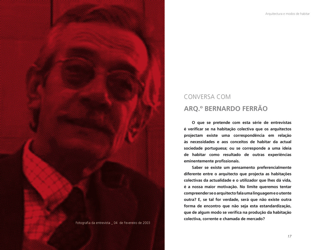 “Boa tarde Arquitecto Bernardo Ferrão, muito obrigado por este seu tempo precioso, gostaria de colocar uma primeira questão, que tem a ver com a sua formação. No fundo tentar perceber um pouco quais foram as suas primeiras ou as suas grandes influências? Quando fez o seu curso de arquitectura, quando o terminou? e quando começou a ter contacto com a realidade profissional.
