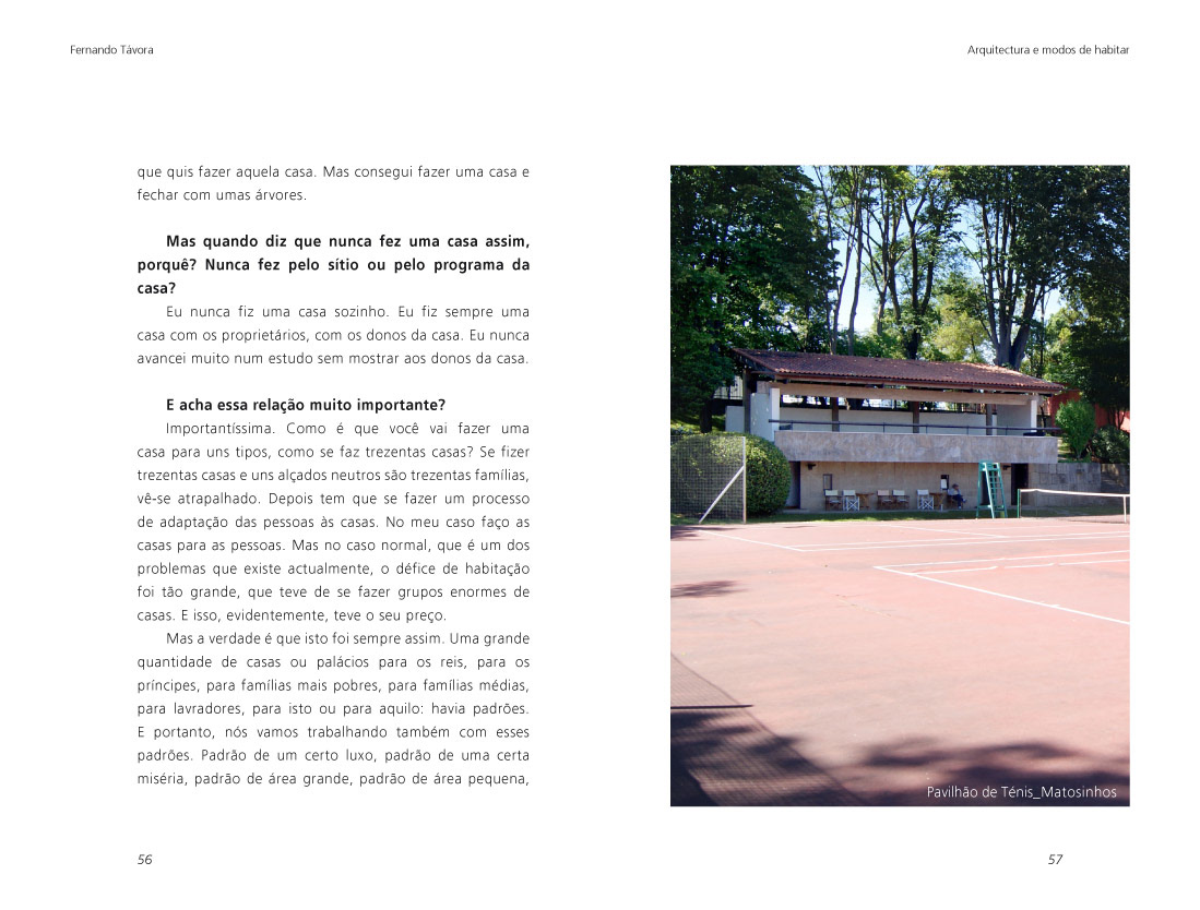 “Trata-se de uma colecção de entrevistas feitas pelo arquitecto Nuno Lacerda Lopes. São conversas entre arquitectos da Escola do Porto onde se procura compreender o processo de construção de um ideal de arquitectura, de profissão, de sociedade e de escola, tendo por base uma reflexão pessoal e aberta e até esclarecer as inquietações teóricas e práticas bem como as circunstâncias que fundamentam a arquitectura portuguesa dos dias de hoje.”