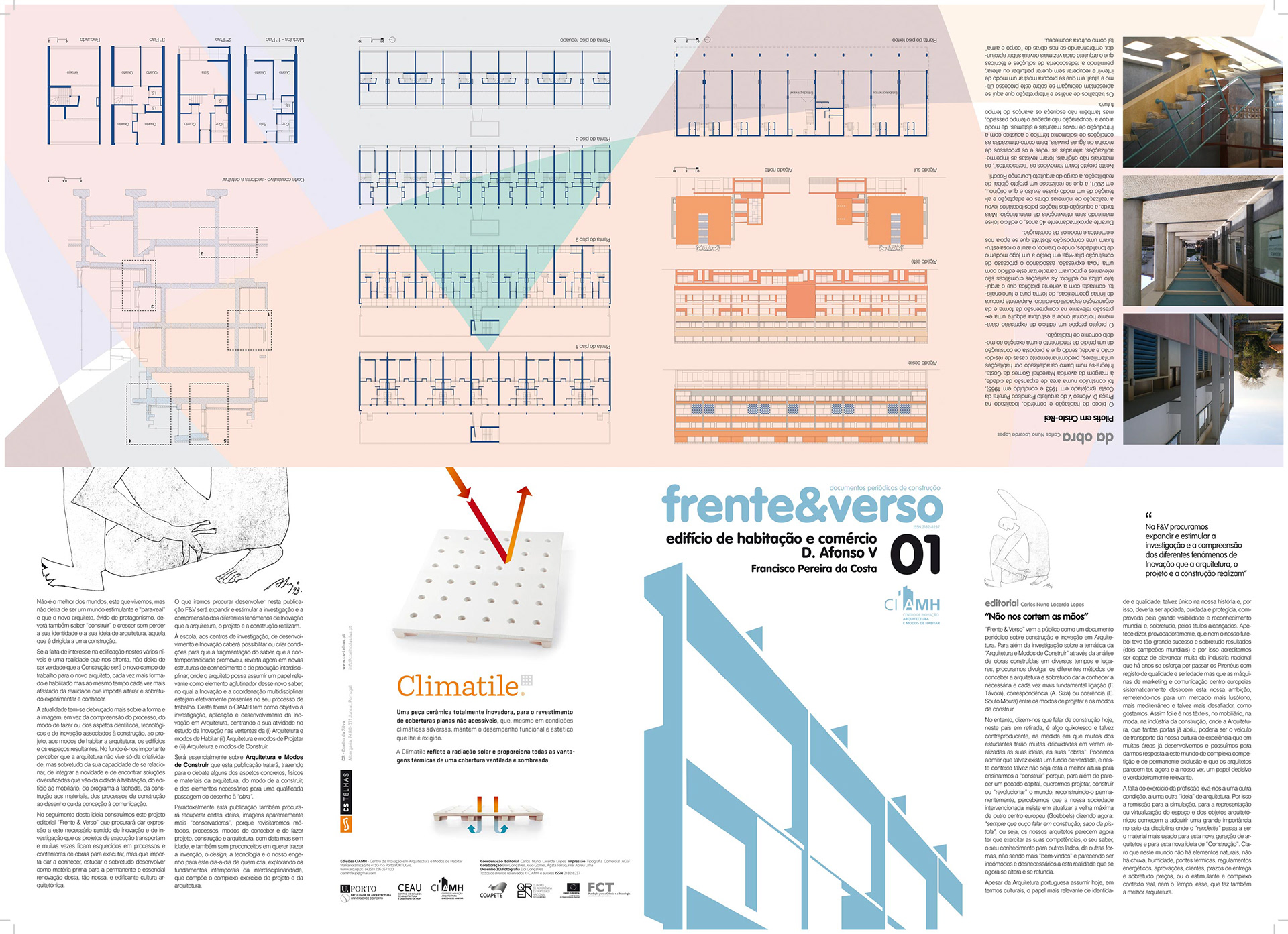“Frente & Verso” vem a público como um documento periódico sobre construção e inovação em Arquitetura. Para além da investigação sobre a temática da “Arquitetura e Modos de Construir” através da análise de obras construídas em diversos tempos e lugares, procuramos divulgar os diferentes métodos de conceber a arquitetura e sobretudo dar a conhecer a necessária e cada vez mais fundamental ligação (F. Távora), correspondência (A. Siza) ou coerência (E. Souto Moura) entre os modos de projetar e os modos de construir. Será essencialmente sobre Arquitetura e Modos de Construir que esta publicação tratará, trazendo para o debate alguns dos aspetos concretos, físicos e materiais da arquitetura, do modo de a construir, e dos elementos necessários para uma qualificada passagem do desenho à “obra”.