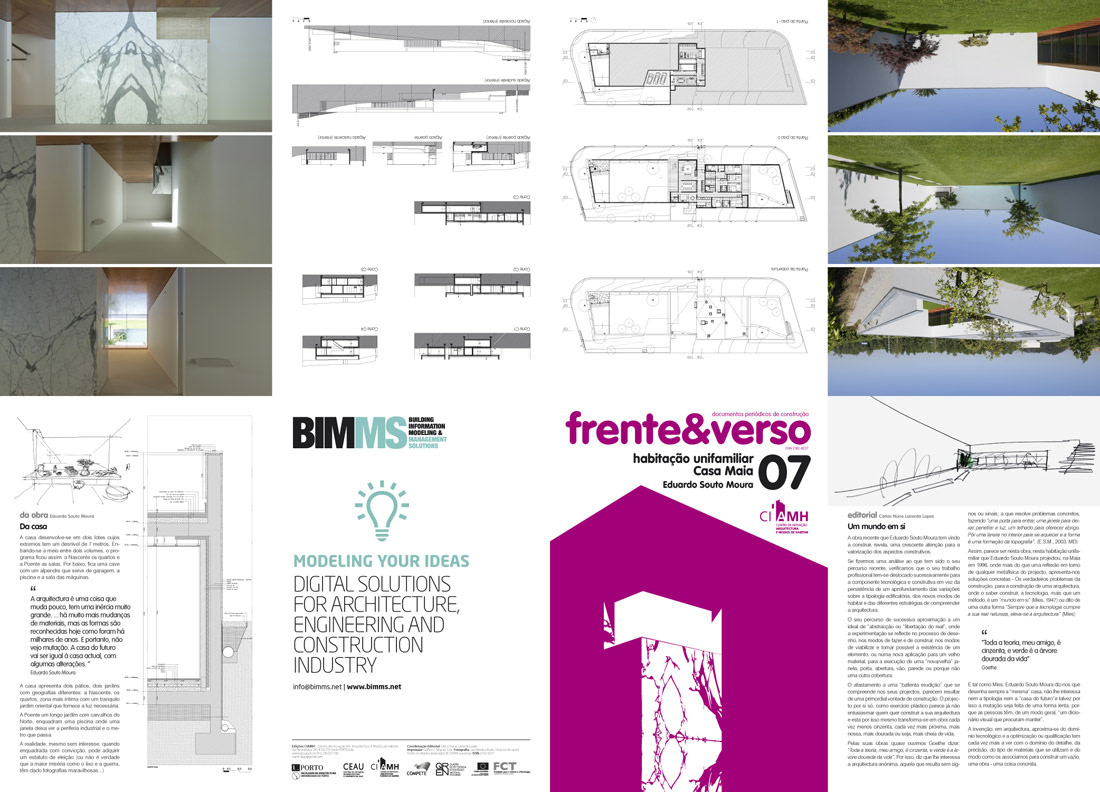 “Frente & Verso” vem a público como um documento periódico sobre construção e inovação em Arquitetura. Para além da investigação sobre a temática da “Arquitetura e Modos de Construir” através da análise de obras construídas em diversos tempos e lugares, procuramos divulgar os diferentes métodos de conceber a arquitetura e sobretudo dar a conhecer a necessária e cada vez mais fundamental ligação (F. Távora), correspondência (A. Siza) ou coerência (E. Souto Moura) entre os modos de projetar e os modos de construir. Será essencialmente sobre Arquitetura e Modos de Construir que esta publicação tratará, trazendo para o debate alguns dos aspetos concretos, físicos e materiais da arquitetura, do modo de a construir, e dos elementos necessários para uma qualificada passagem do desenho à “obra”.