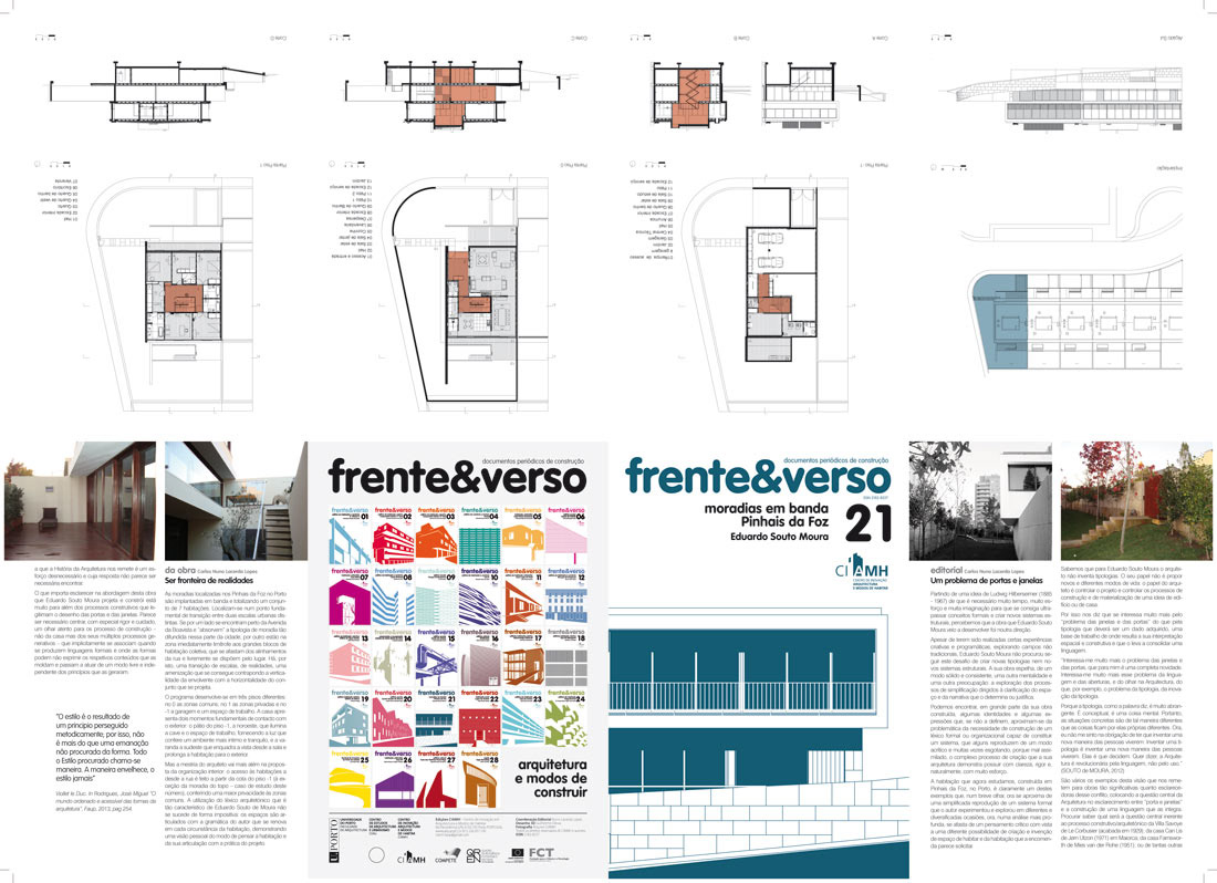 “Frente & Verso” vem a público como um documento periódico sobre construção e inovação em Arquitetura. Para além da investigação sobre a temática da “Arquitetura e Modos de Construir” através da análise de obras construídas em diversos tempos e lugares, procuramos divulgar os diferentes métodos de conceber a arquitetura e sobretudo dar a conhecer a necessária e cada vez mais fundamental ligação (F. Távora), correspondência (A. Siza) ou coerência (E. Souto Moura) entre os modos de projetar e os modos de construir. Será essencialmente sobre Arquitetura e Modos de Construir que esta publicação tratará, trazendo para o debate alguns dos aspetos concretos, físicos e materiais da arquitetura, do modo de a construir, e dos elementos necessários para uma qualificada passagem do desenho à “obra”.