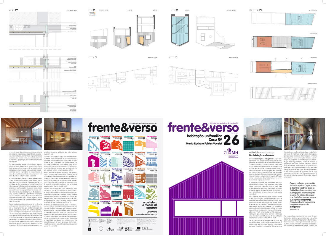 “Frente & Verso” vem a público como um documento periódico sobre construção e inovação em Arquitetura. Para além da investigação sobre a temática da “Arquitetura e Modos de Construir” através da análise de obras construídas em diversos tempos e lugares, procuramos divulgar os diferentes métodos de conceber a arquitetura e sobretudo dar a conhecer a necessária e cada vez mais fundamental ligação (F. Távora), correspondência (A. Siza) ou coerência (E. Souto Moura) entre os modos de projetar e os modos de construir. Será essencialmente sobre Arquitetura e Modos de Construir que esta publicação tratará, trazendo para o debate alguns dos aspetos concretos, físicos e materiais da arquitetura, do modo de a construir, e dos elementos necessários para uma qualificada passagem do desenho à “obra”.