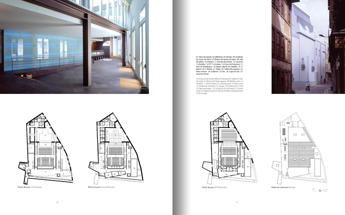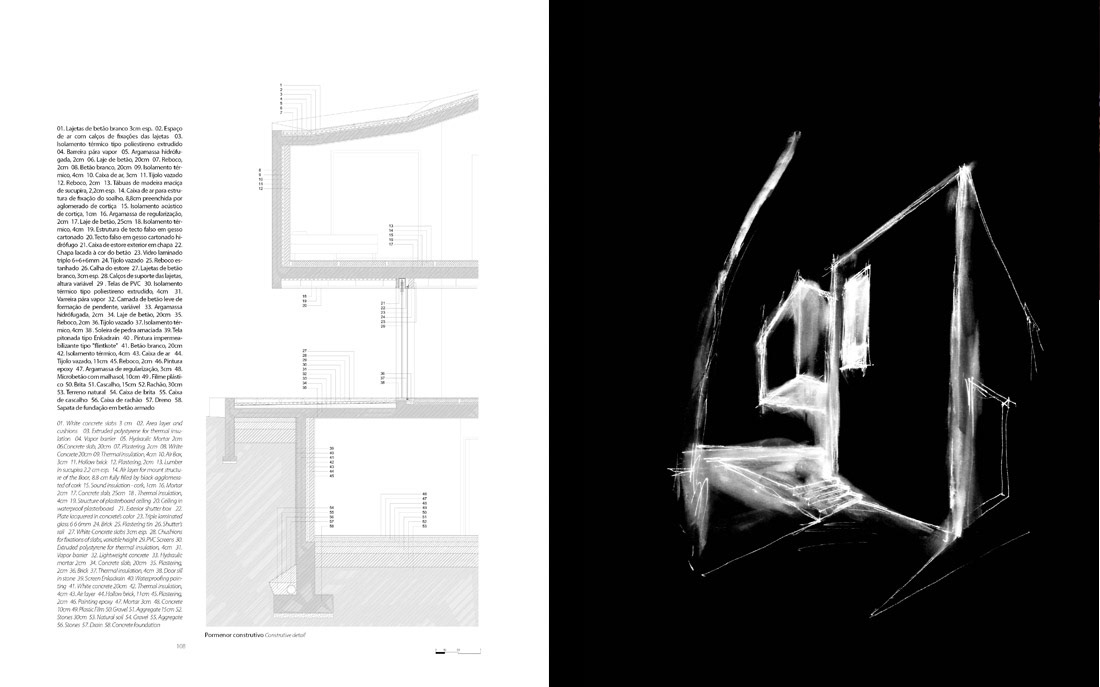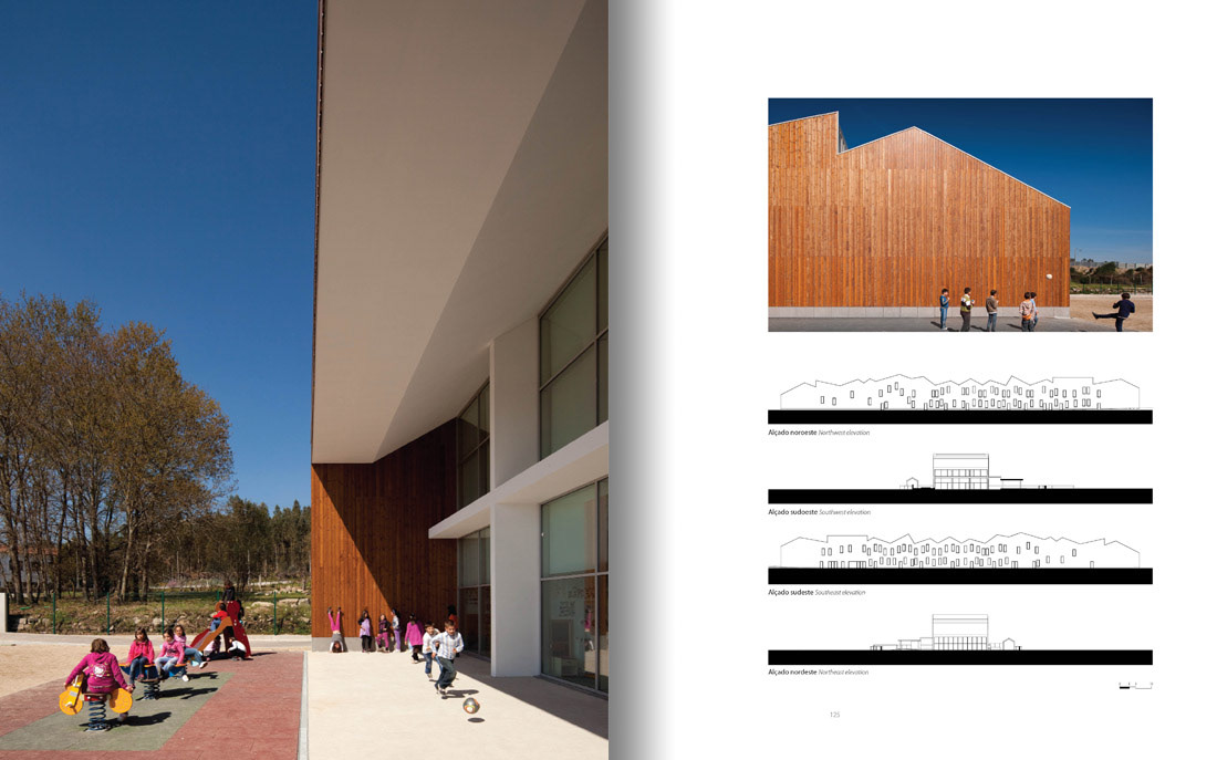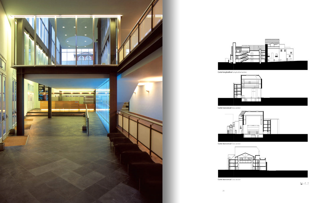 Do edifício, de forma marcadamente longitudinal respondendo ao lugar, sobressaem duas superfícies encerradas, pontuadas pela repetição aparentemente desordenada do mesmo vão. Assim, vãos pontuais dançam ao longo dos alçados laterais criando um ritmo vibrante que contrasta com os topos abertos, de amplos envidraçados. O movimento criado pela cobertura prolonga-se para o interior, contagiando os espaços com a sua linguagem materializada em desníveis e diferenças de alturas, resultando sempre em espaços diversificados e distintos.”