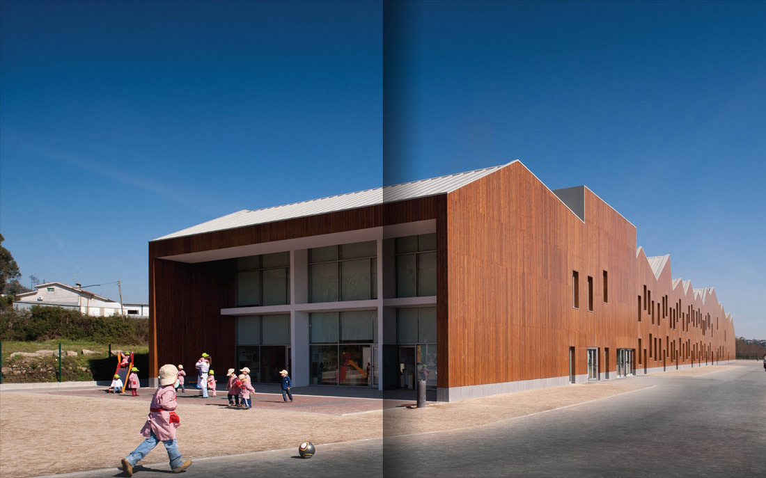 A escola tem por base uma ideia de paisagem e, como um cenário, o seu desenho é complanar e a sua espacialidade desenvolve-se no interior de uma caixa revestida a madeira que desenha o horizonte, organizando-o.