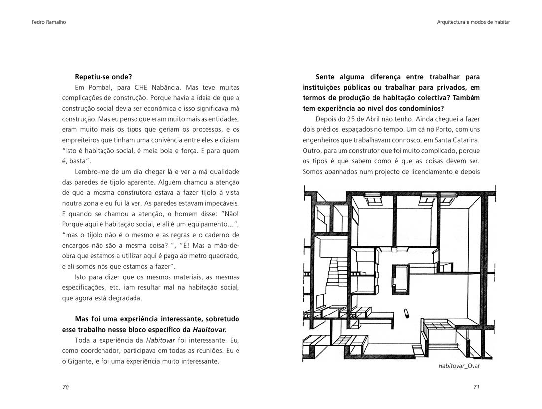 “Trata-se de uma colecção de entrevistas feitas pelo arquitecto Nuno Lacerda Lopes. São conversas entre arquitectos da Escola do Porto onde se procura compreender o processo de construção de um ideal de arquitectura, de profissão, de sociedade e de escola, tendo por base uma reflexão pessoal e aberta e até esclarecer as inquietações teóricas e práticas bem como as circunstâncias que fundamentam a arquitectura portuguesa dos dias de hoje.”