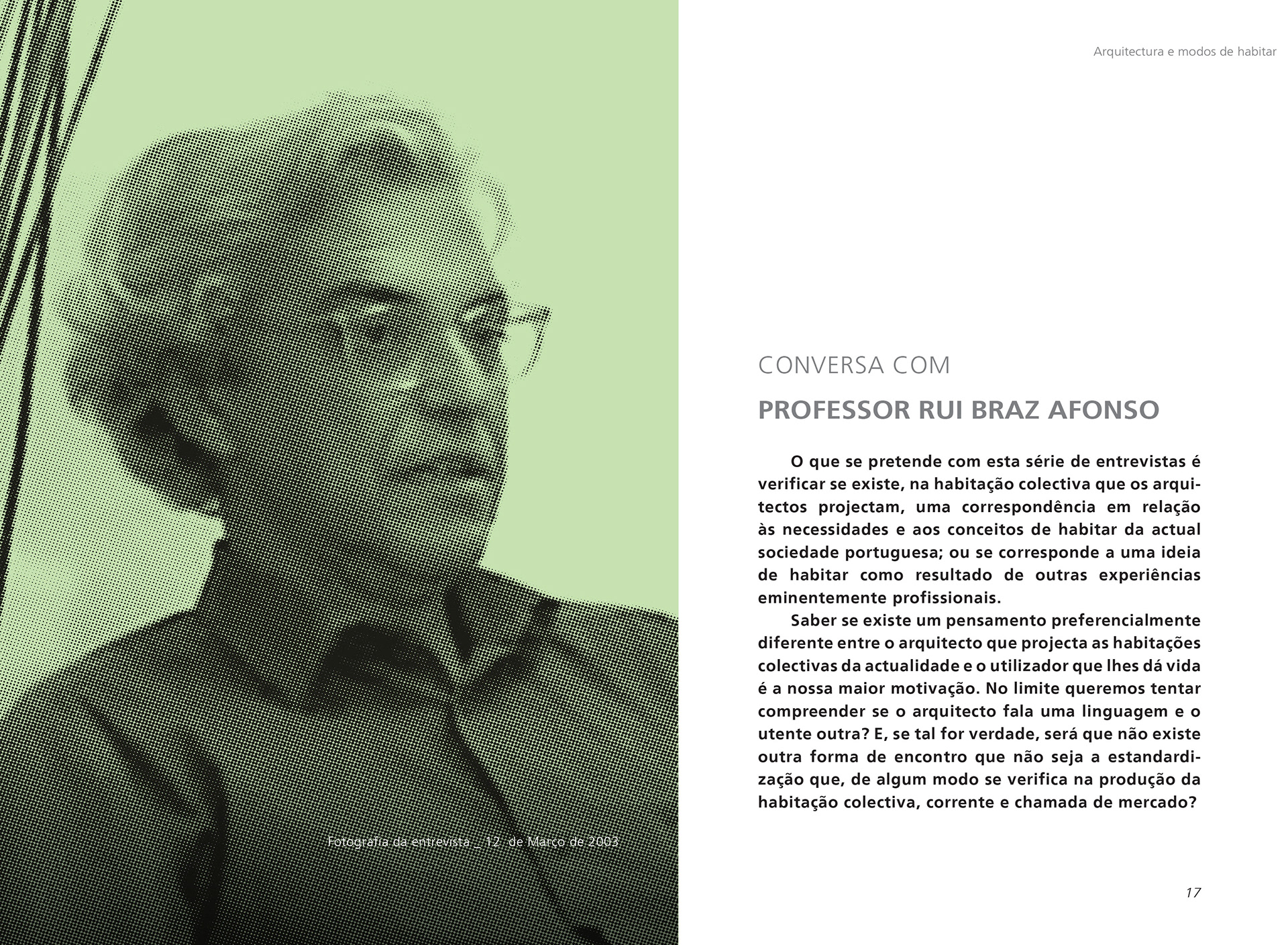 “Trata-se de uma colecção de entrevistas feitas pelo arquitecto Nuno Lacerda Lopes. São conversas entre arquitectos da Escola do Porto onde se procura compreender o processo de construção de um ideal de arquitectura, de profissão, de sociedade e de escola, tendo por base uma reflexão pessoal e aberta e até esclarecer as inquietações teóricas e práticas bem como as circunstâncias que fundamentam a arquitectura portuguesa dos dias de hoje.”